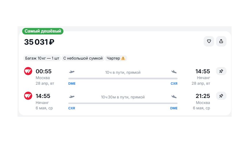 Если выбрать путешествие на рейсах Red Wings с вылетом из Домодедово в Нячанг 28 апреля и возвращением из ЮВА в столицу 6 мая, то round trip обойдется всего в 35 тыс. руб. В стоимость уже включен багаж 10 кг, что для короткого пляжного вояжа может быть вполне достаточно.