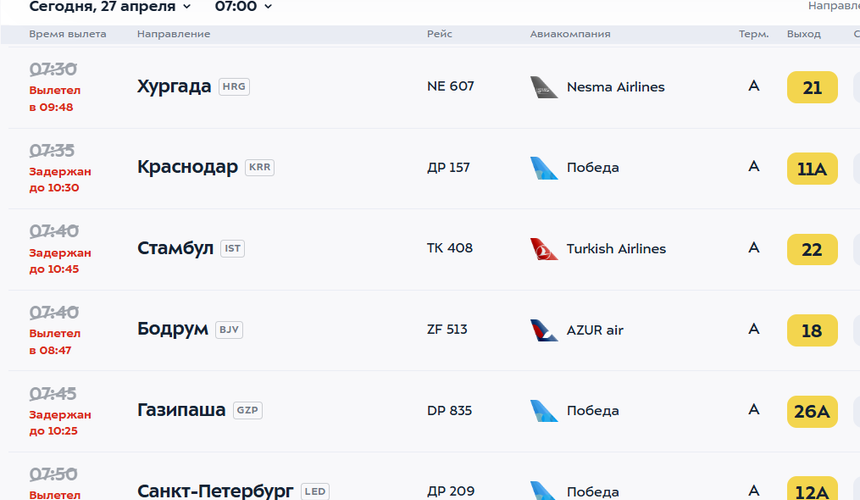 На вылеты по туристическим маршрутам также повлияла непогода. Ajet VF276 взял курс на Стамбул на 5,5 часа позже запланированного, VF248 на том же направлении пока что сдвинут на 4 часа. ТК3015 в Анталью задержали на 6,5 часа. Пока что на 6 часов скорректировано время рейса NE611 в Хургаду Nesma Airlilnes, на 4 часа - NE643 в Шарм-эль-Шейх.